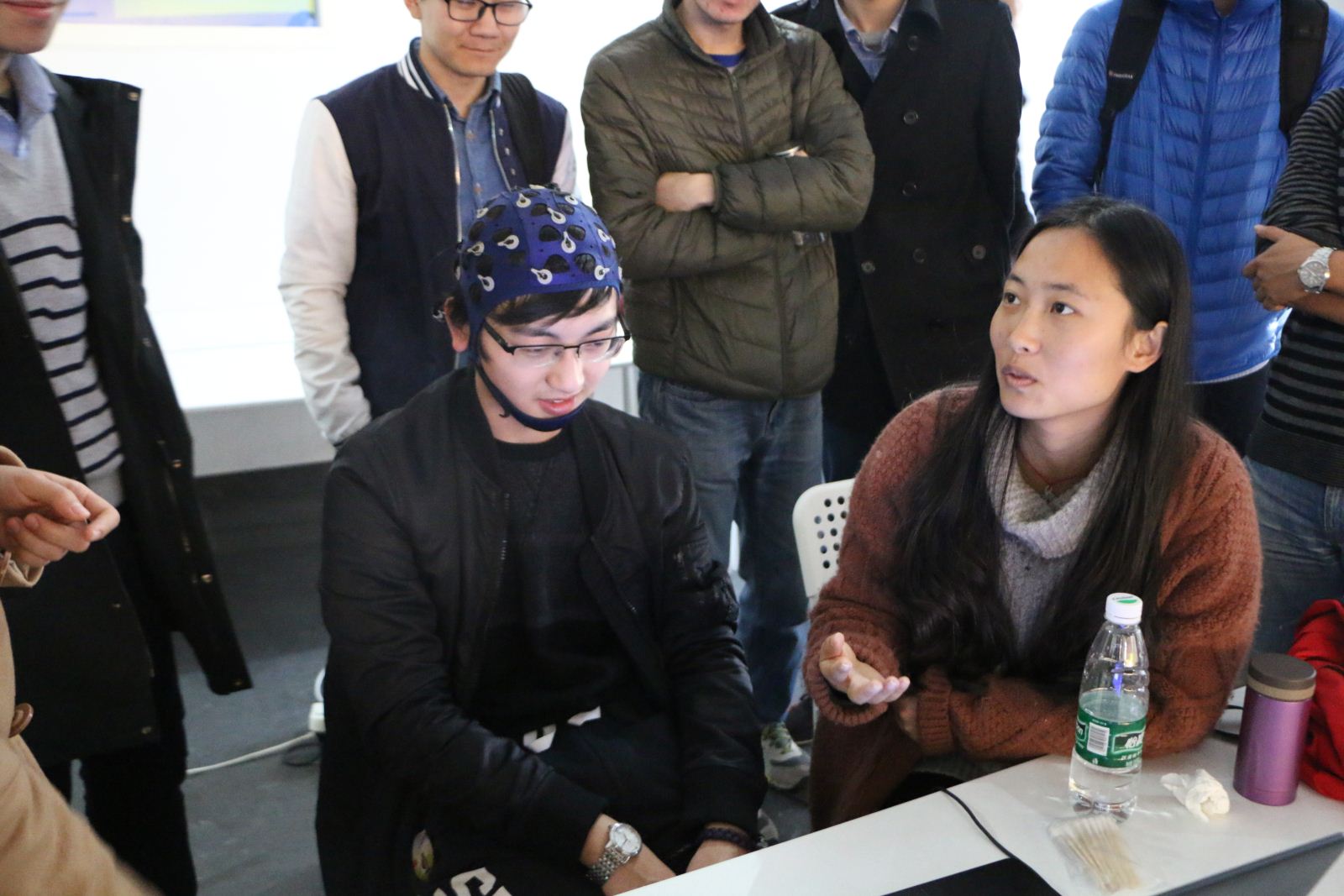 此外在论坛的现场,计算机与软件学院、心理学院、教育学部的三支学生团队也带来了各自的创新实践项目的展示和体验。无人机、VR、机器人等深深吸引了同学们的兴趣。心理学院学生团队开发的基于SSVEP的脑机接口应用,可以通过测试头皮脑电信号打印出被测同学想的数字,令人称奇。分论坛最终在同学们的体验中圆满结束。