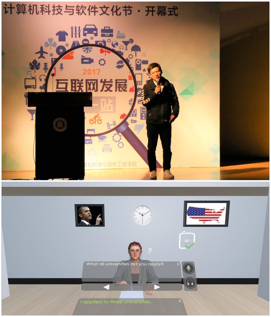 裴麒凯同学展示了一个VR英语学习项目,这是一款利用虚拟技术和AI技术模拟真实英语对话场景以帮助同学们学习英语的应用。同时,裴麒凯也对VR的发展和技术给出了自己的理解。