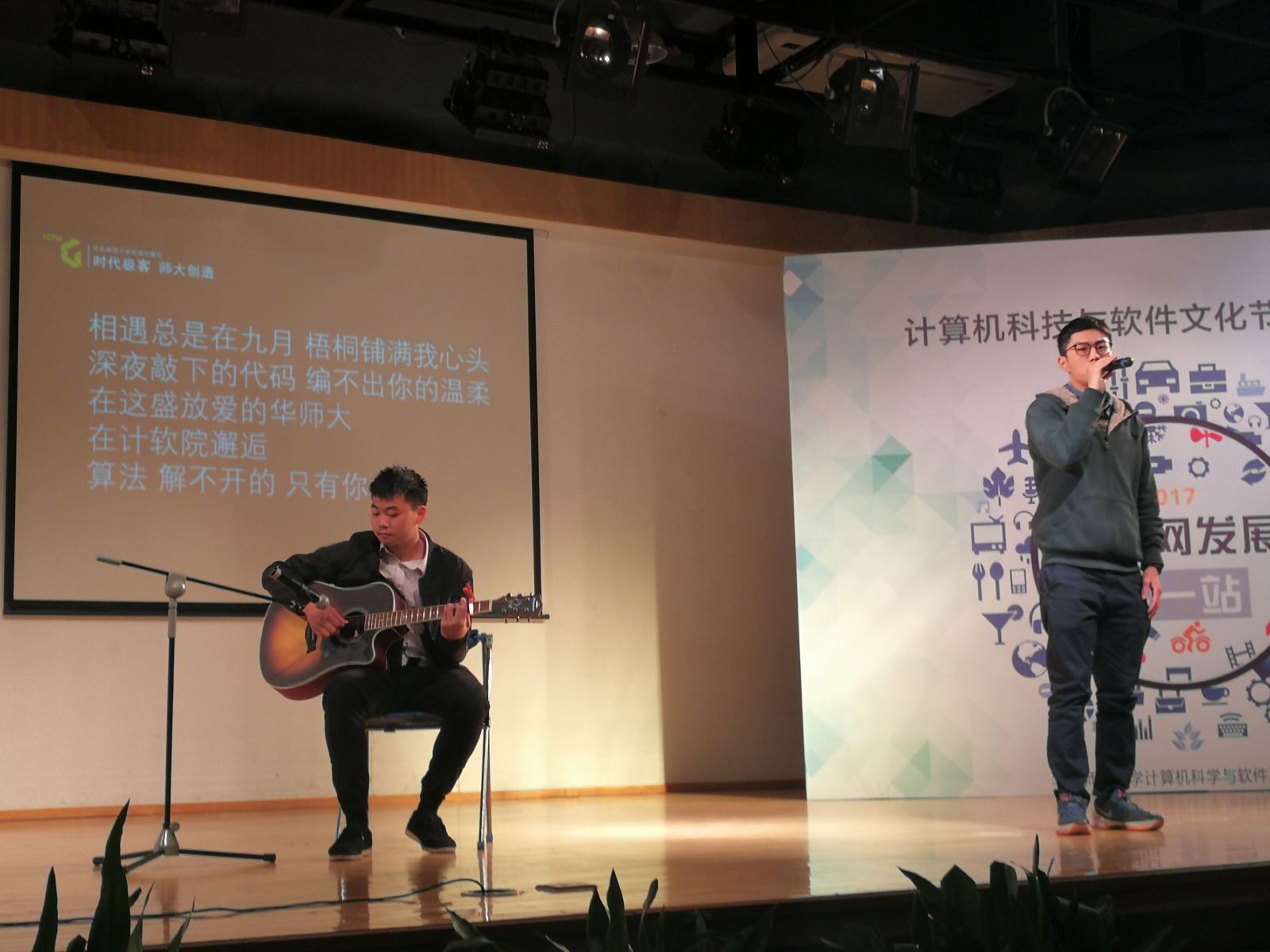 在精彩的演讲之后,陈前嘉和邓贵强同学带来了歌曲《成都(华东师大计软院版)》助兴,为大家在认真听讲后带来一些放松和愉悦。