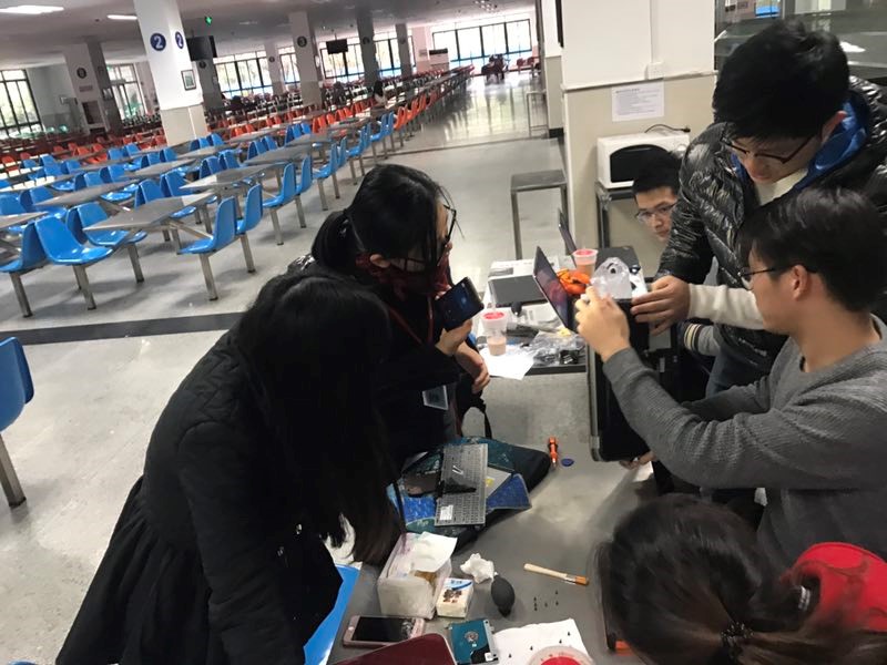 工作人员提前准备好维修、清理器材,布置好场地等候同学们的到来。活动刚开始,许多同学带着自己的电脑闻讯赶来,志愿者们拿起工具认真地进行各种测试、检查。