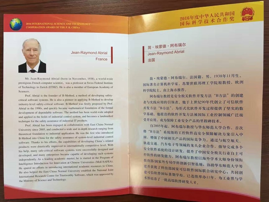 简·埃蒙德·阿布瑞尔教授是国际著名工业控制领域可信软件开发方法的奠基人,安全攸关软件开发方法“B方法”的创建者。他将巴黎地铁14号线的开发技术成功应用到我国的轨道交通中,指导卡斯柯信号有限公司研发了高安全信号系统,开发出达到国际最高安全等级的软件,并成功打入国际市场,实现了对国外技术封锁与市场垄断的突破。值得一提的是,近期在上海试运行的首条无人驾驶地铁线17号线“1701号”,作为上海地铁2017年的首列新车,就离不开阿布瑞尔及他的团队这十二年来的付出。这是一项突破行业瓶颈的关键技术。