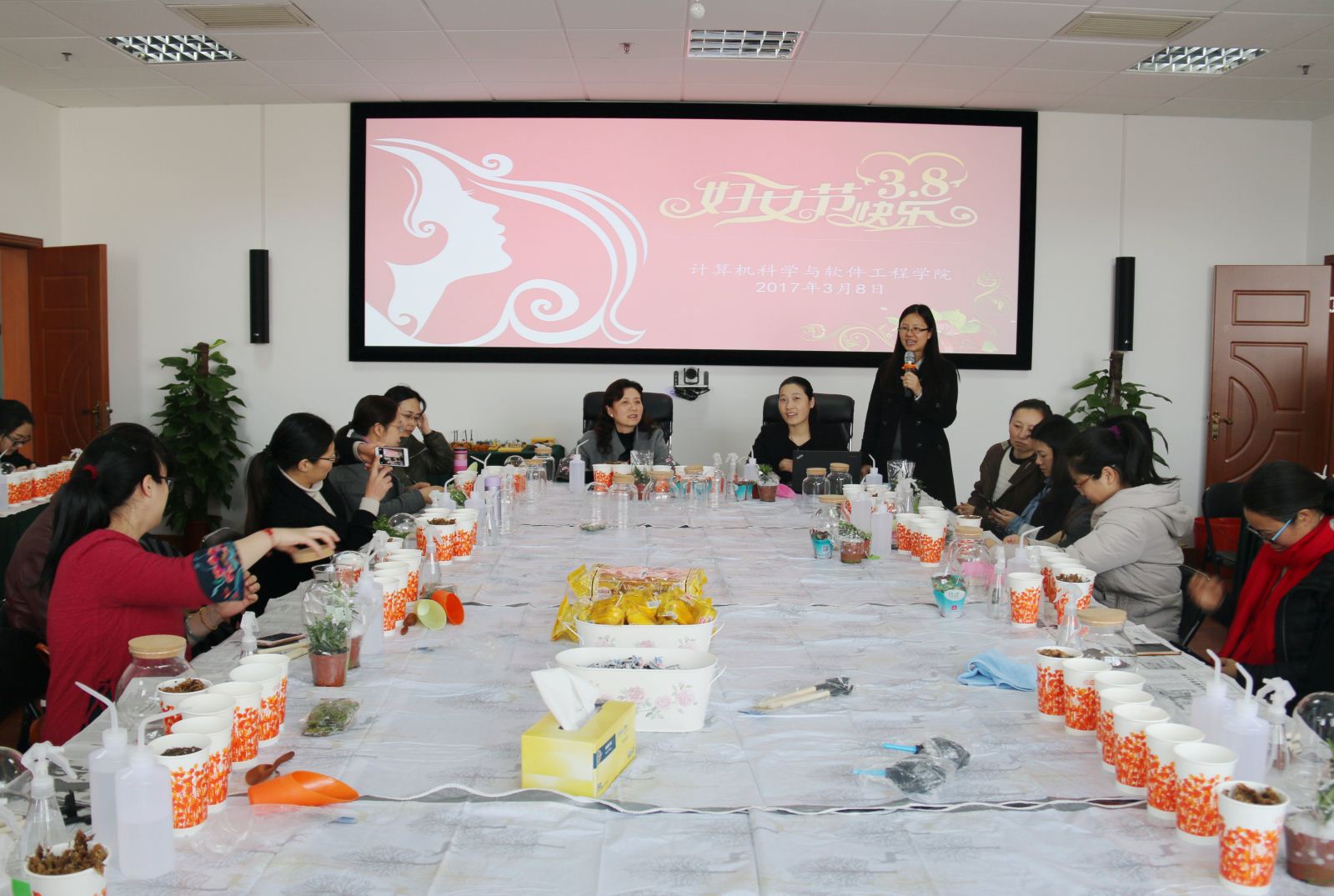 教师们报名踊跃,会议室座无虚席,院工会精心为大家准备了花式繁多的各种素材。活动由院工会女工委员陈蕾老师主持,李恺书记代表学院向女教师表达了节日的祝福,介绍了此次活动的意义。