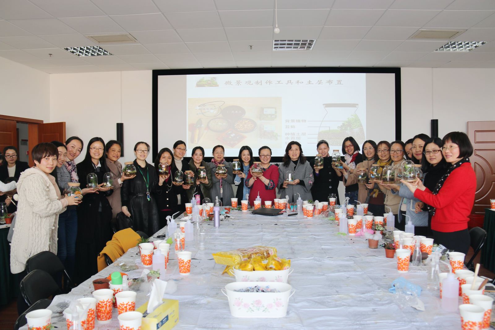 熊老师一步步耐心的讲解了苔藓微景观的制作流程、注意事项、生存环境,制作技巧等等,大家听的仔细做的认真。一节课下来,女老师们都交出了自己满意的作品,有田园、有小桥、有栅栏,当然主角还是生机勃勃的苔藓植物,生动的场景活灵活现的展示出来,学院这个特别的三八节礼物,让女教师们乐享植物之美。