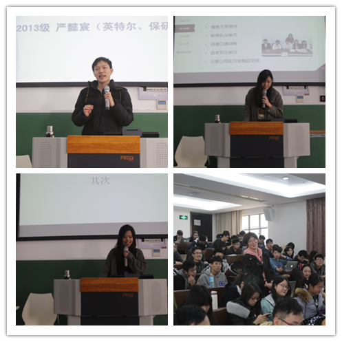 会上,2013级富士通公司实习生孙诗韵、英特尔实习生严懿宸和ebay实习生陈子溦三位同学用生动幽默的语言分享了自己投递简历和面试的经验,交流了实习期间遇到的点滴和心得体会,让14级同学们对实习的过程和意义有了进一步的了解。