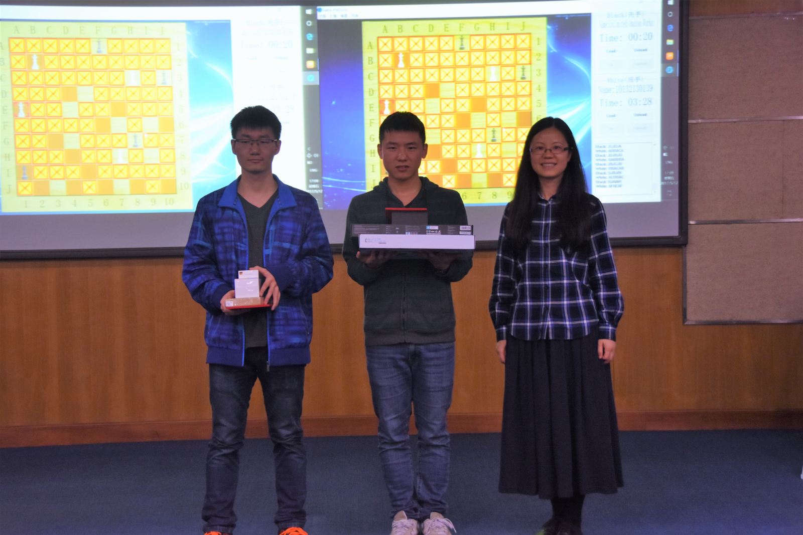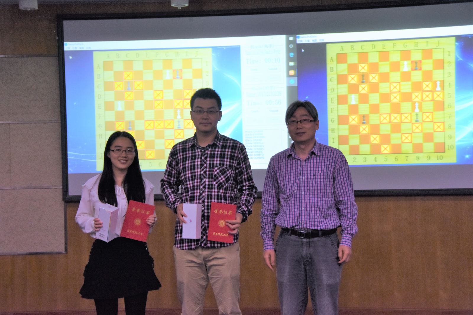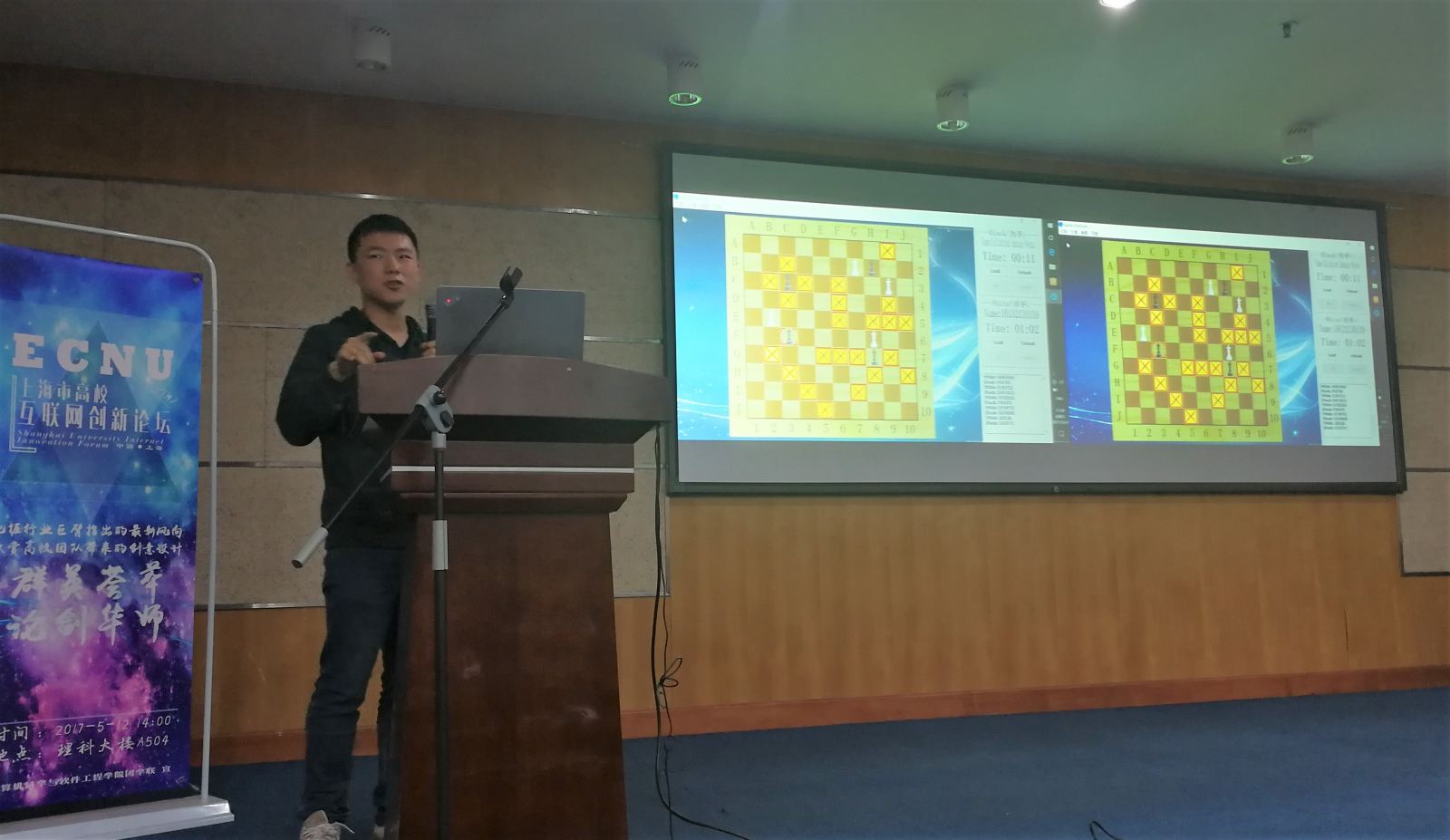 在各大高校优秀项目倾情展示过后,华东师范大学首届趣味棋AI大赛举行现场决赛。此项赛事由计算机与软件学院科技创新协会首次举办,比赛采用亚马逊棋(详细规则可参考/Data/View/2508)。同学们用编写的人工智能程序现场对抗。最终周众欣的人工智能程序以2:1战胜周锐,夺得了华东师范大学首届趣味棋AI大赛的冠军。