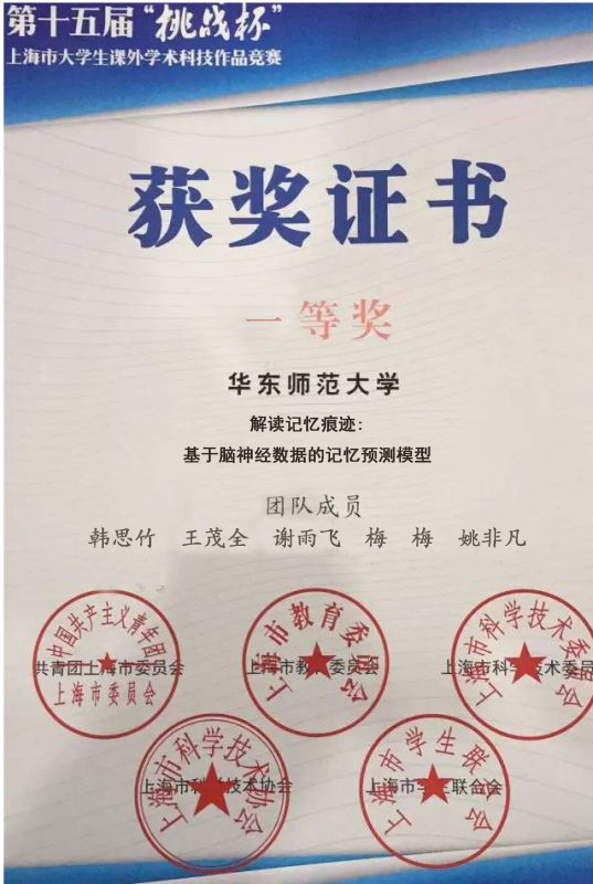 第十五届“挑战杯”上海市大学生课外学术科技作品竞赛决赛于6月10日在上海应用技术大学举行,此次大赛由团市委、市教委、市科委、上海学联等单位共同主办。我院学生王茂全、谢雨飞与心理学院等院系学生合作完成的项目《解读记忆痕迹:基于脑神经数据的记忆预测模型》斩获一等奖(指导教师:吕钊、心理学院库逸轩)。与此同时,我院学生毛侠、陈新宇、宋健、杨秀丽、纪宇的作品《基于增强现实的工业环境维修辅助系统》荣获三等奖(指导教师:史建琦)。