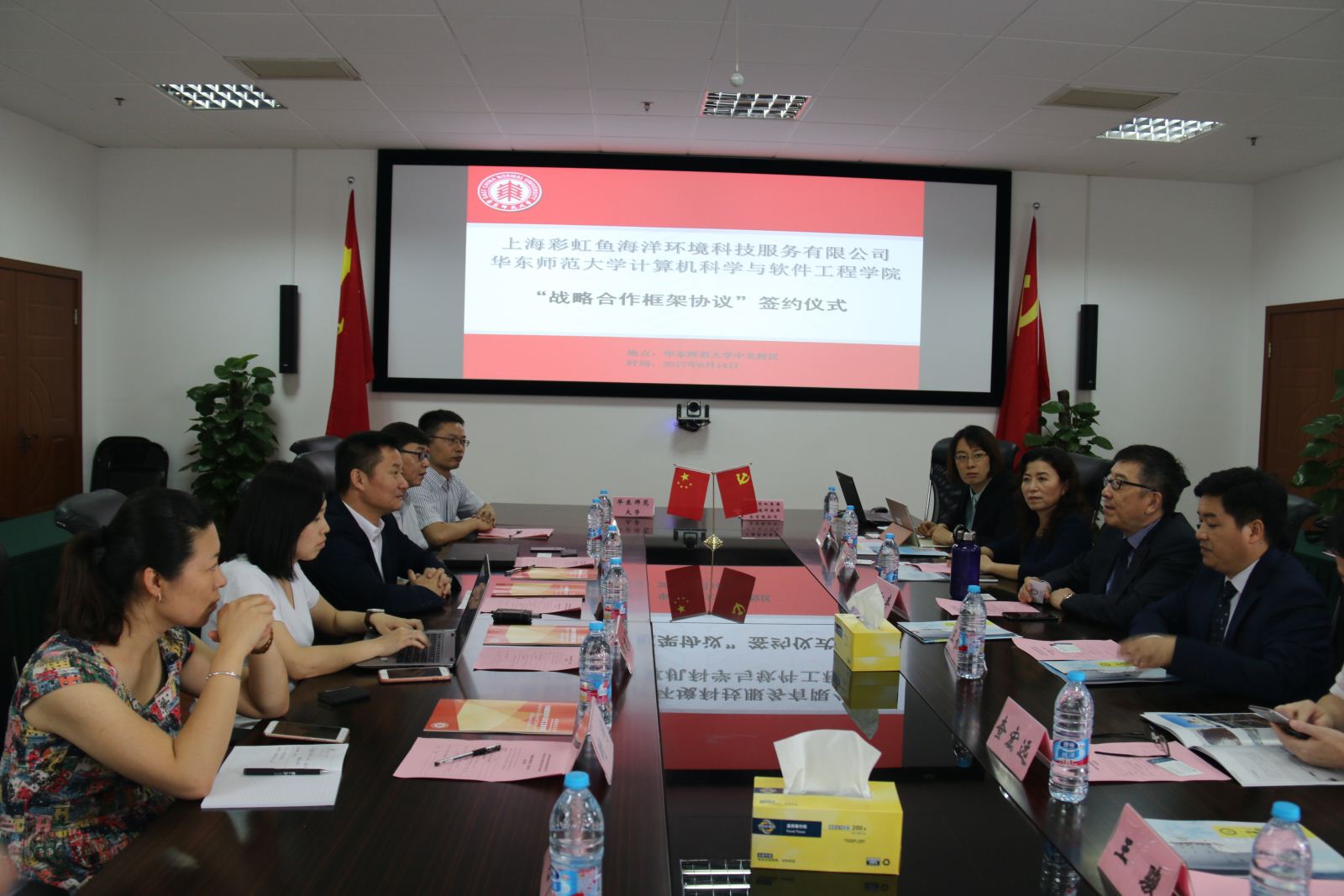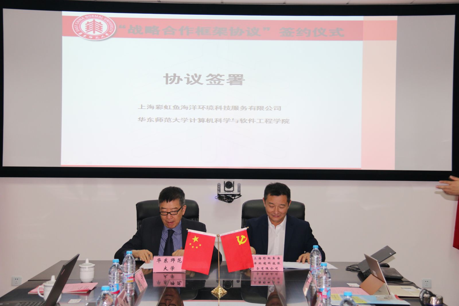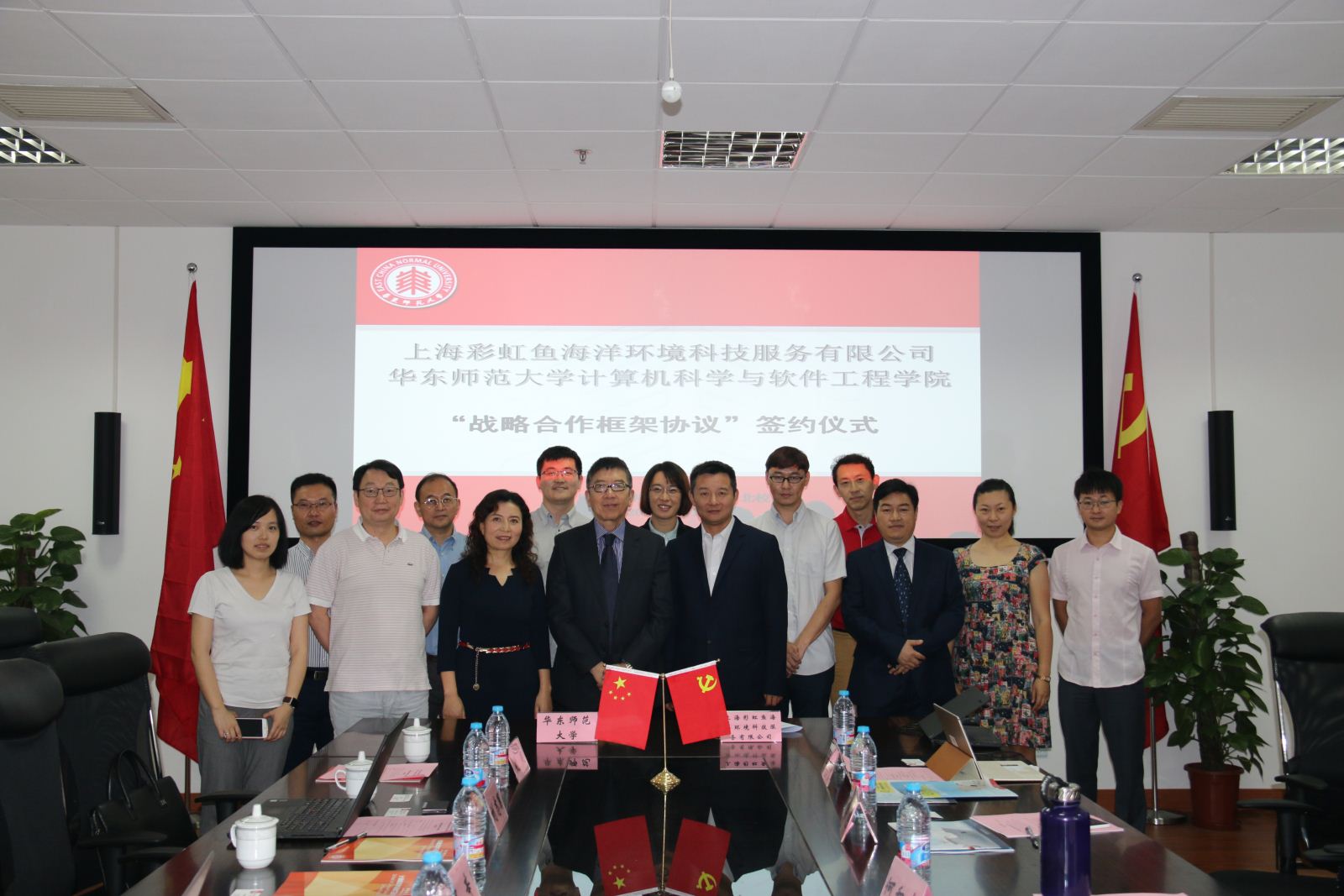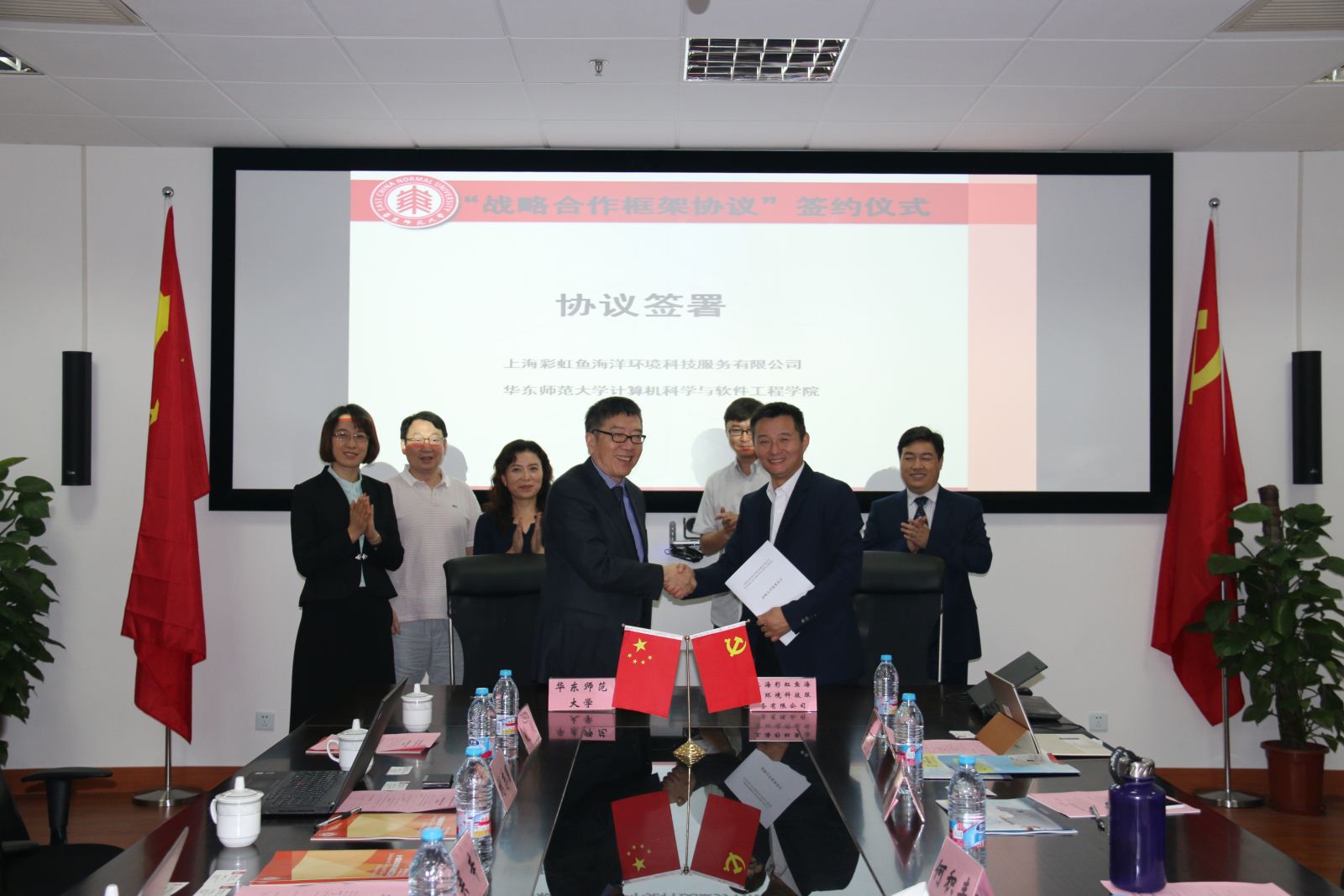 6月14日,计算机科学与世俱杯sjb官网与上海彩虹鱼海洋环境科技服务有限公司在中北校区签订战略合作框架协议。上海彩虹鱼海洋科技股份有限公司总裁吴辛博士、上海彩虹鱼海洋环境科技服务有限公司总经理刘志国博士、副总经理郭超颖博士、产业园事业部副总经理街宁、技术总监倪健等一行来校参加协议签订仪式和学术交流。计软学院院长何积丰院士、党委书记李恺教授、常务副院长王长波教授、査宏远教授、何晓丰教授、教育部软硬件协同设计与应用工程中心副主任王江涛高级工程师、数据科学系副主任王祥丰博士以及金博博士出席签约仪式。