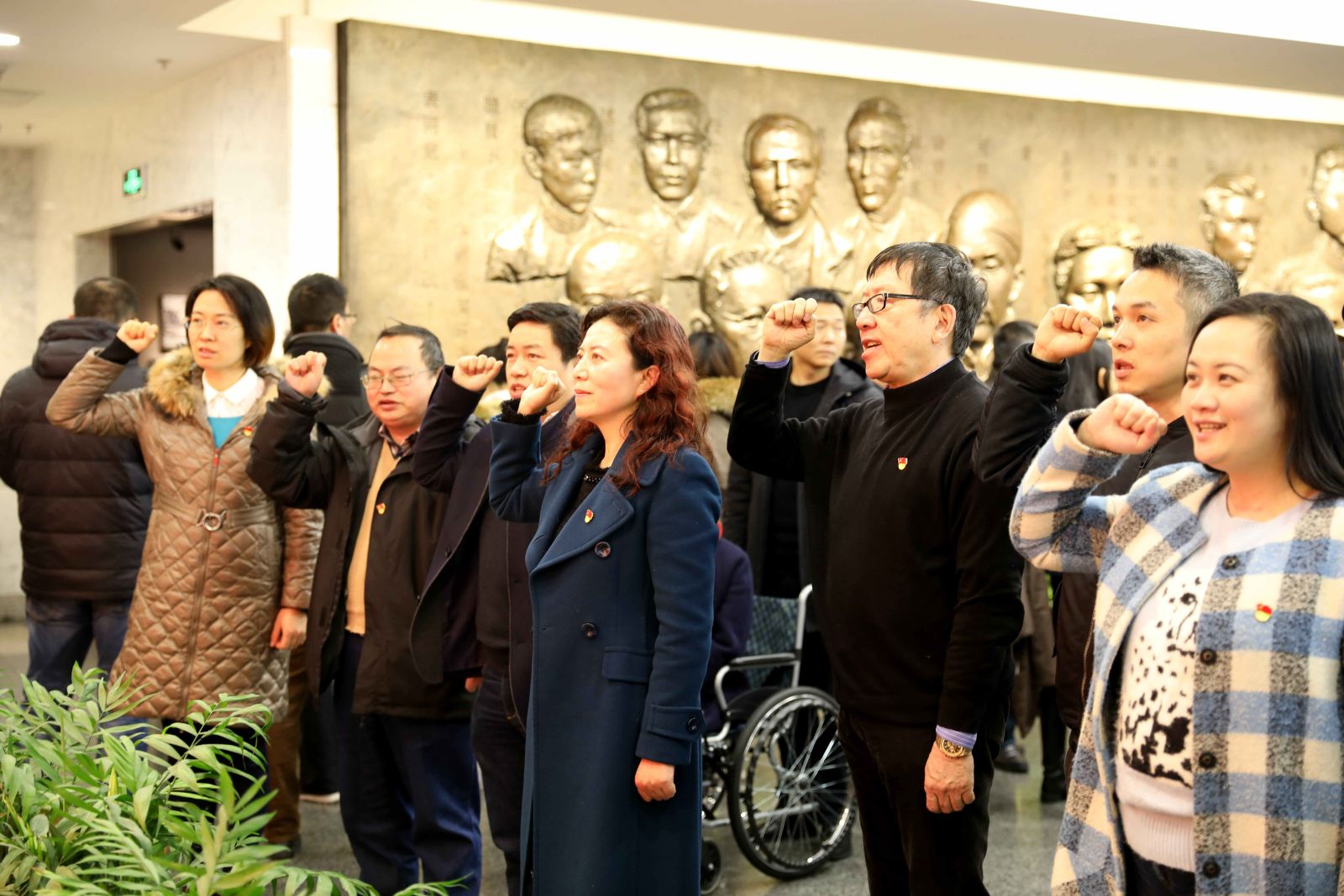 在中共一大会址纪念馆宣誓厅,学院全体党委委员佩戴党员徽章,面对党旗,在党委书记李恺同志领誓下,一起重温入党誓词,以坚定的宣誓,表达不忘初心、牢记使命的信念和决心,并在中共一大代表群像浮雕前合影。
