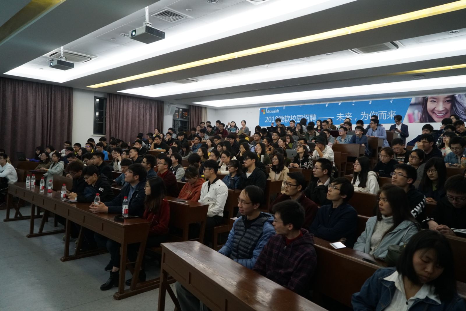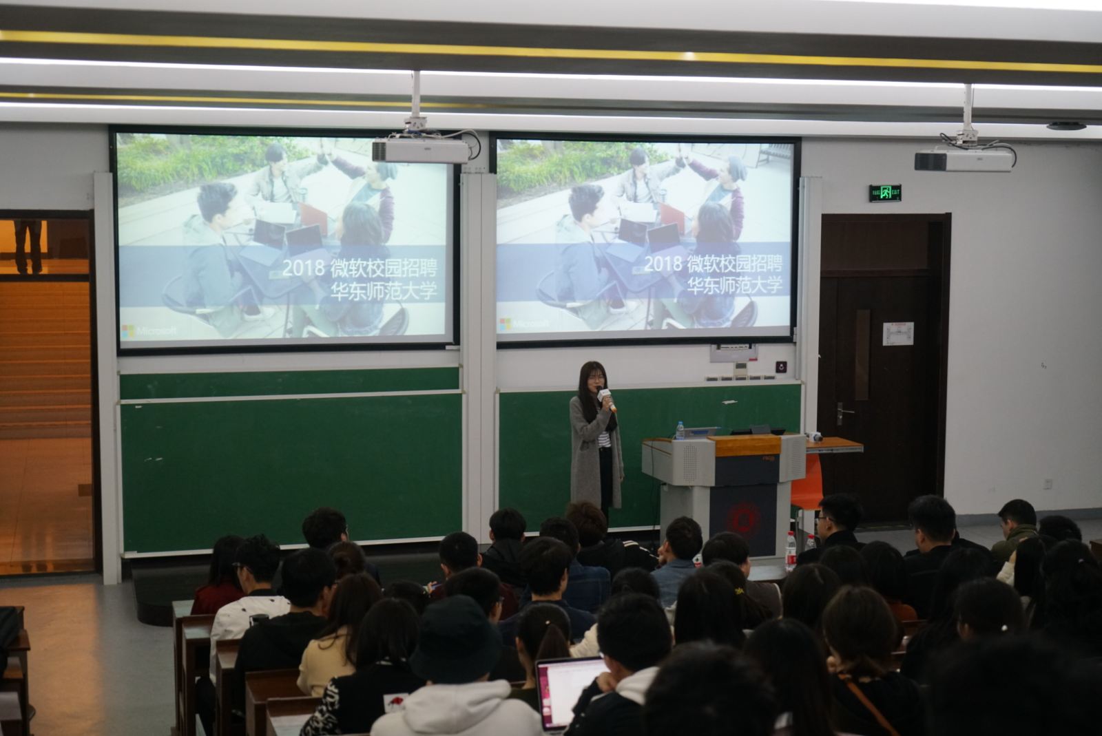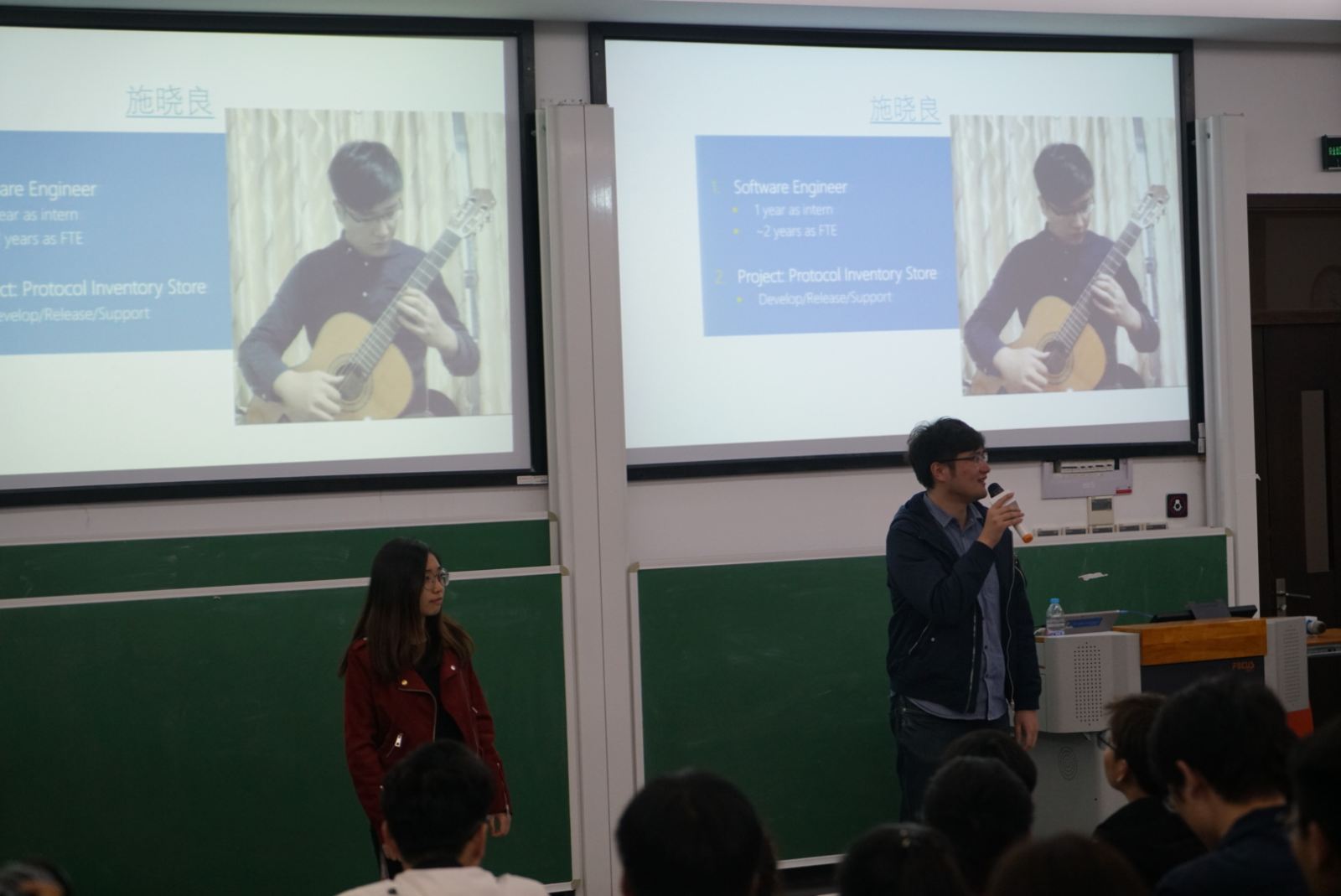 随后,毕业于华东师范大学的学长学姐们分享了他们在微软的工作经历。软件开发工程师施晓良学长介绍了他的面试经历及在微软的项目经历;技术支持工程师唐周益丹学姐为同学们介绍了技术支持部的工作和她个人在微软的体验。
