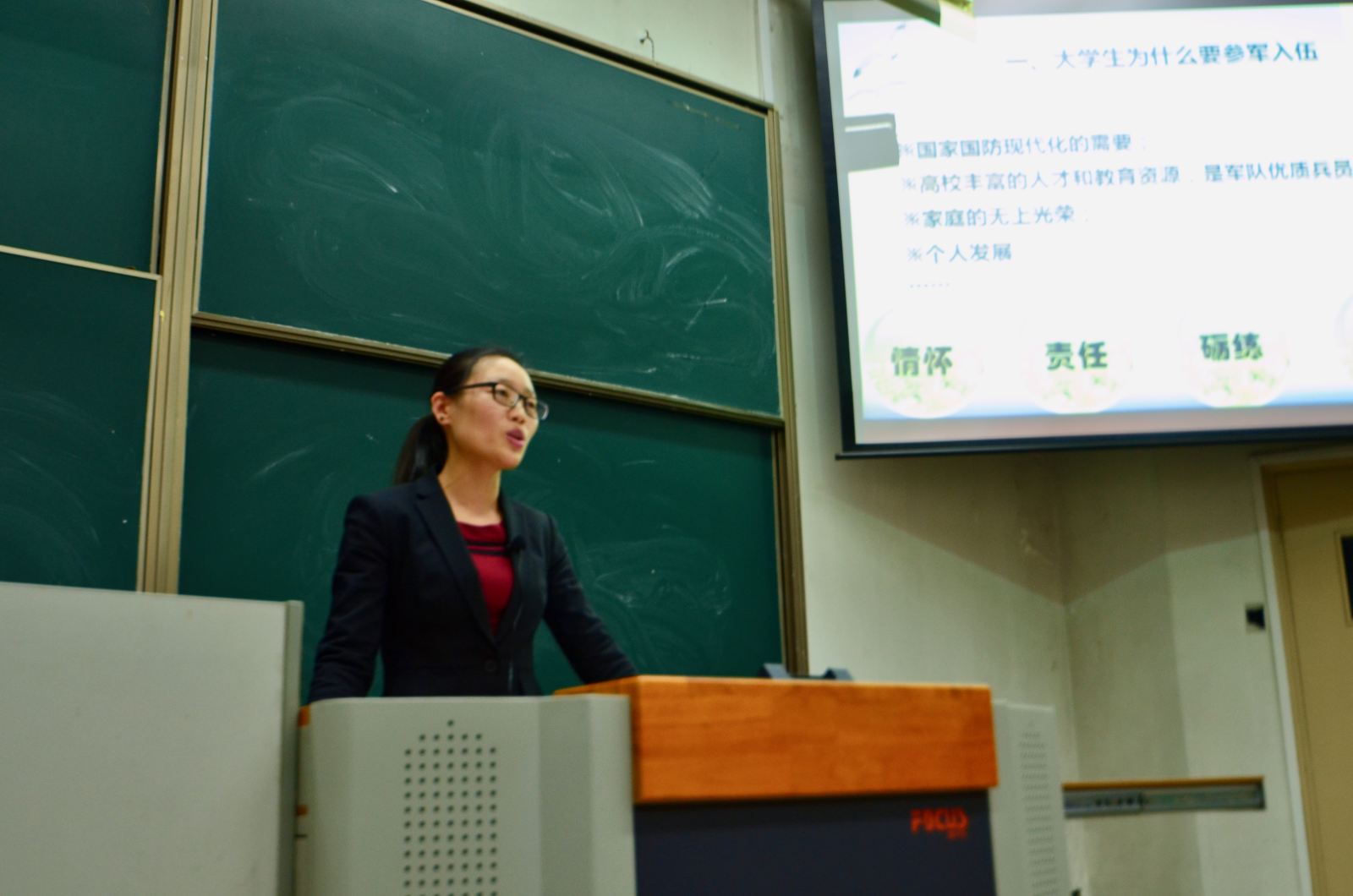 会议开始,孙老师首先朗读了习主席写给南开大学新入伍大学生的信,信中习主席对大学生参军入伍表示了肯定与鼓励,并希望他们“在军营这个大熔炉里百炼成钢,书写绚烂、无悔的青春篇章”。随后,同学们观看了由华东师范大学参军入伍学生录制的视频,视频中的他们怀着满腔热血,携笔从戎,在自己的青春篇章中写下了浓墨重彩的一笔。孙老师还向大家具体介绍了大学生参军入伍的基本条件和要求,详细介绍了国家对大学生应征入伍在学费补偿、考研加分、落户等方面的优惠政策。
