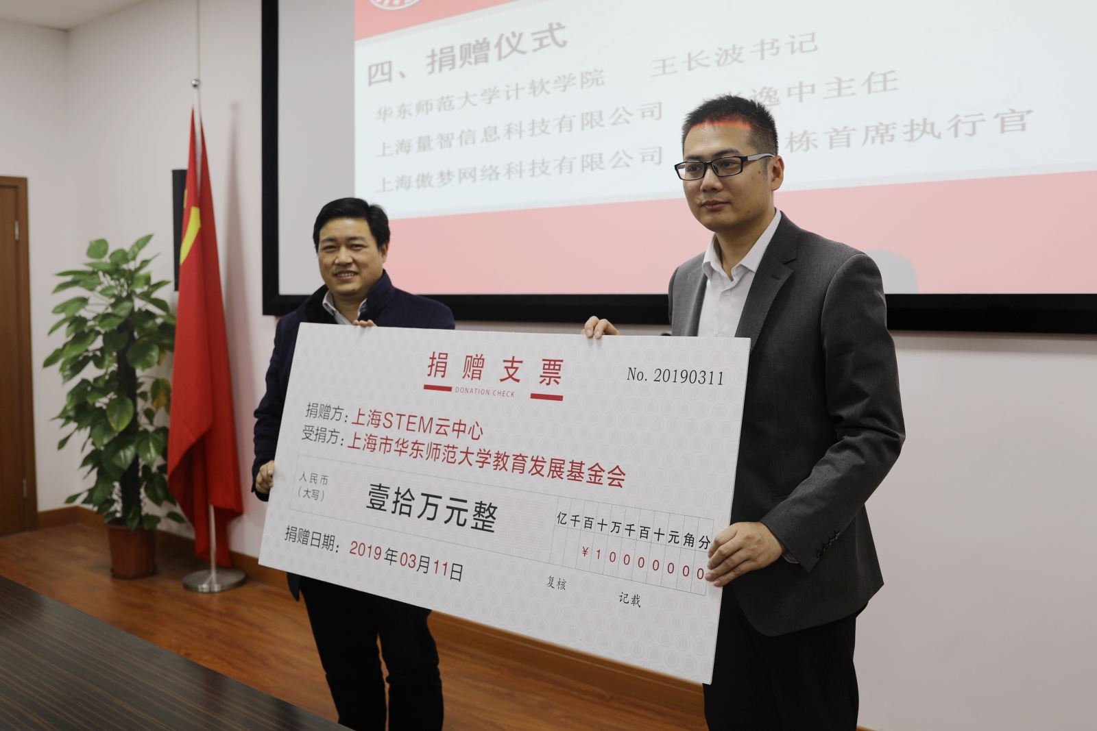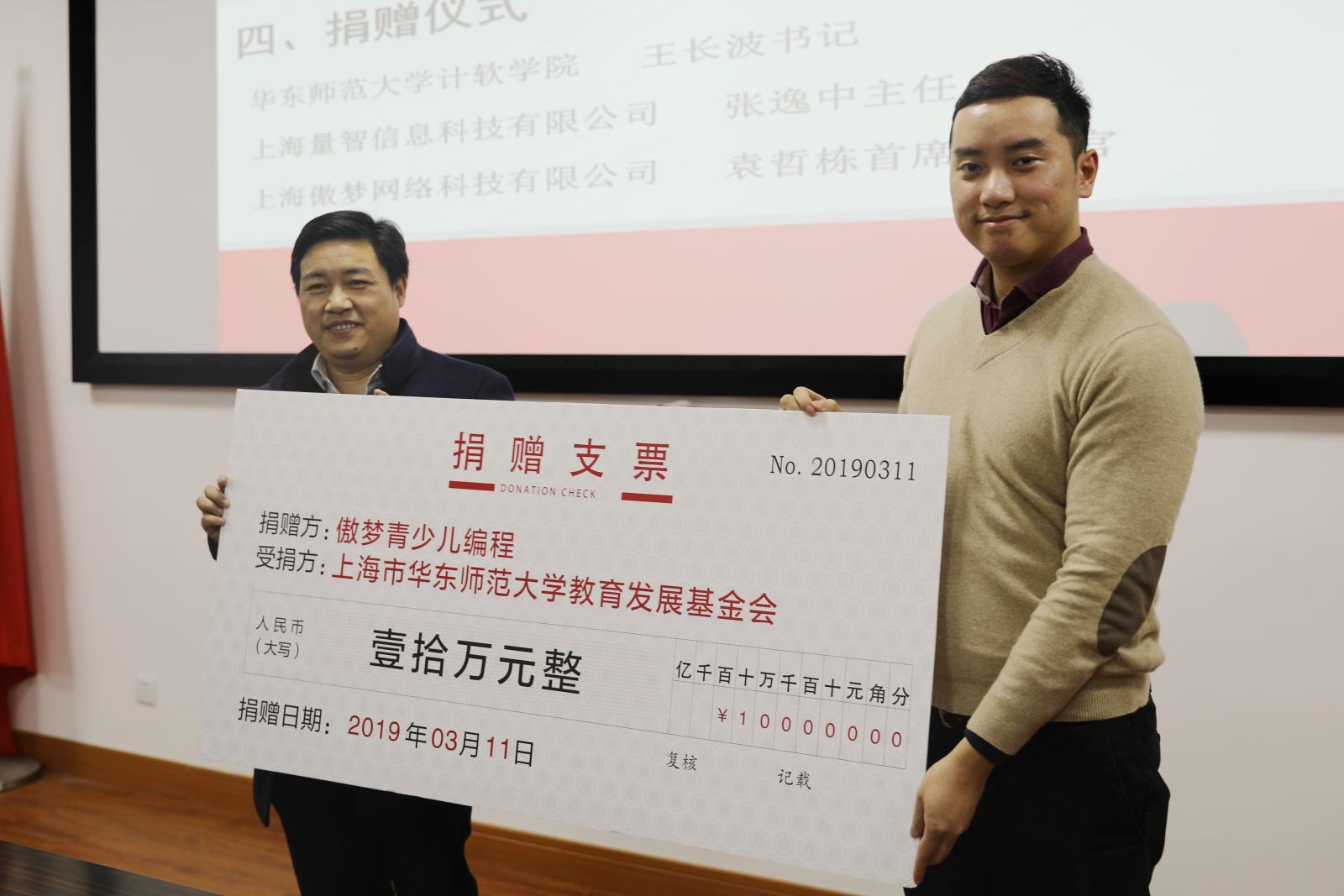 上海STEM云中心主任、06级校友张逸中表示本次与学院的合作是一个美好的开端,未来将与学院开展更加深入和广泛的合作。张逸中校友捐赠10万元设立“STEM云中心”专项奖学金,旨在激励学院学生学业提升,成长成才。傲梦编程创始人、08级校友袁哲栋向学院捐赠10万元设立计软学院“傲梦”专项,旨在奖励各方面进步明显的学生以及支持学生成长就业相关活动的开展。
