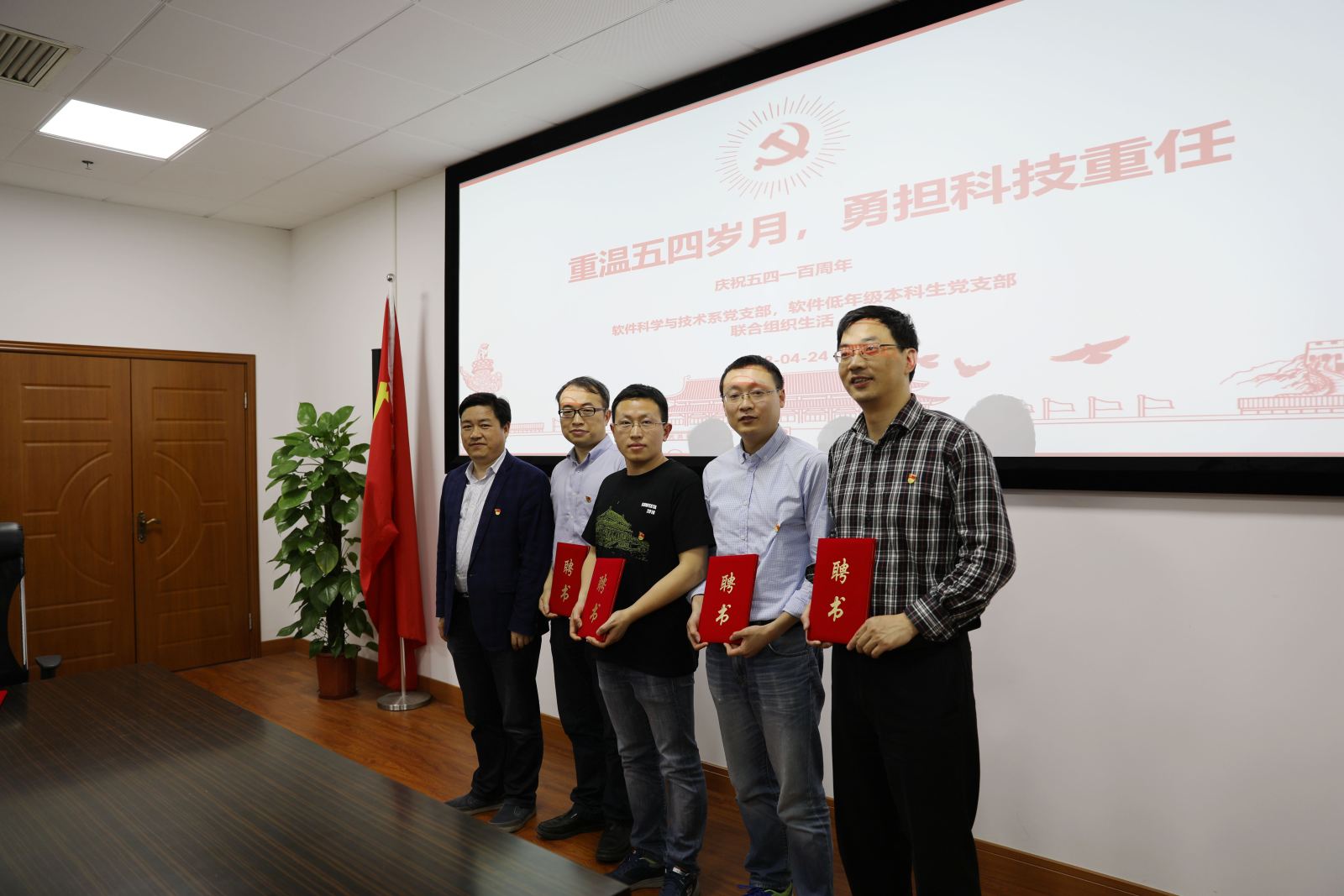 随后,软件科学与技术系党支部与软件低年级本科生党支部进行了党员结对仪式。邓玉欣、彭超、何高奇、陈良育等软件系教师党员代表上台接受聘书,正式担任结对辅导老师。结对在一定程度上可以说是对本科生导师制度的延伸,教师党员在为学生党员的思想、学习、实践能力等发展提供帮助的同时,也可以拉近教师与学生之间的距离,了解学生的现实诉求,发现自身的问题,以实现教学相长。