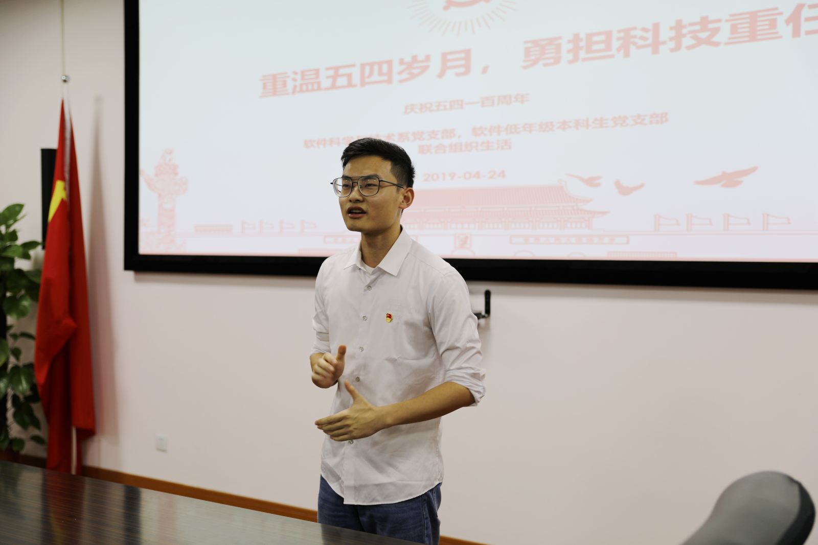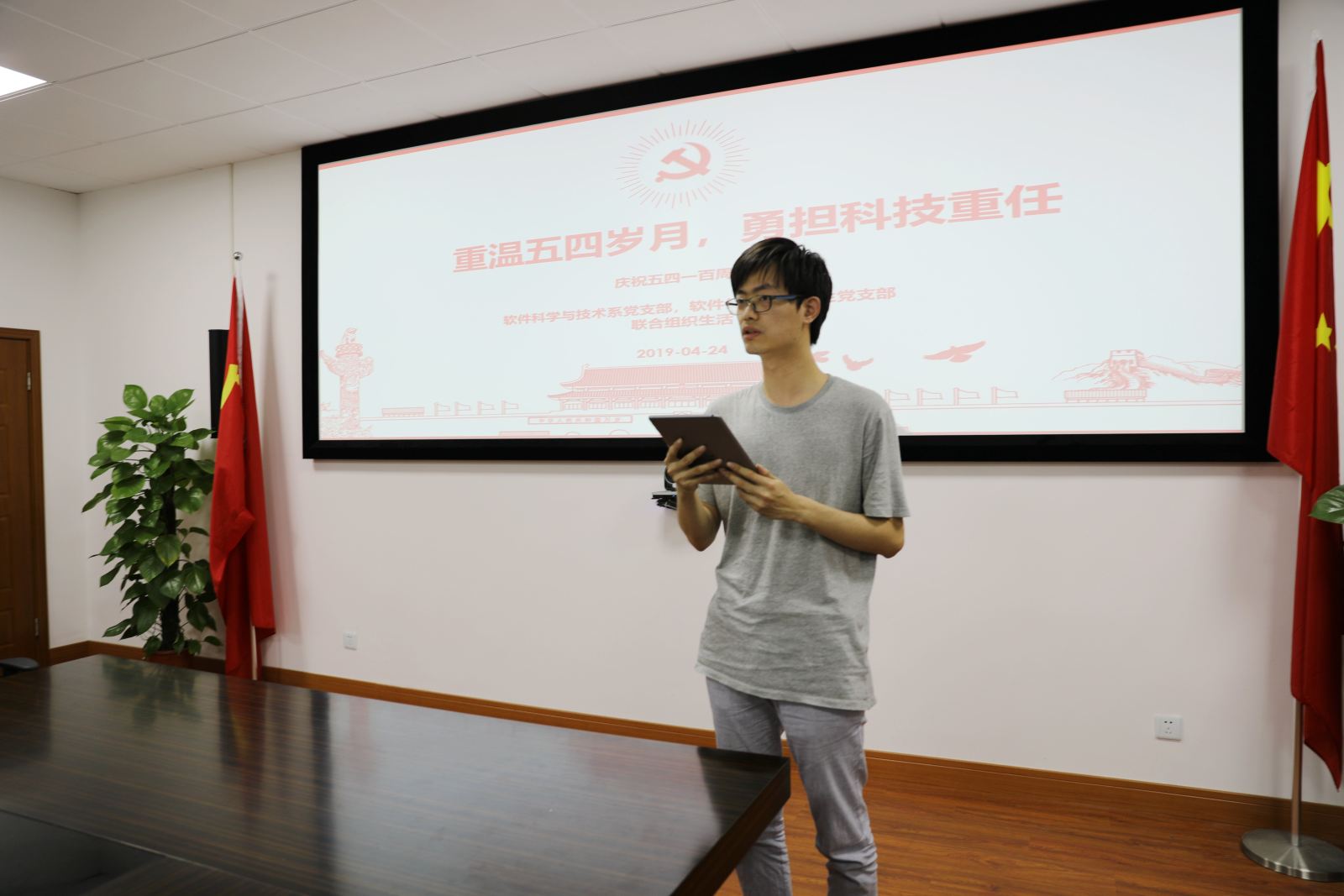 活动伊始,彭超老师向在场的教师党员与学生党员介绍了本次联合组织生活的开展目的与主要内容:由于当下学生普遍都有学习主动性不足、干劲不足的情况, 因此作为一支示范性党支部,软件科学与技术系党支部以开展教师党员与学生党员结对的方式,预期建立一个长效机制,让教师党员有更多的机会影响学生党员,提升软件系的学风建设;同时借此“五四”运动百年之期,结合专业特色,探讨在当代背景下如何更好地扬弃“德先生”与“赛先生”,为国家培养更多科技栋梁人才。