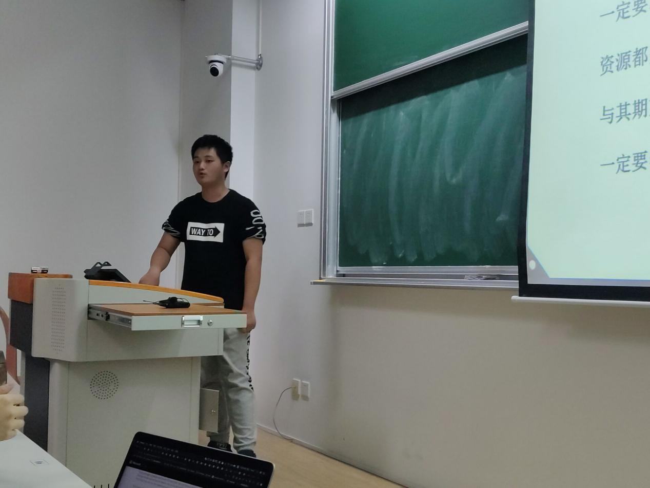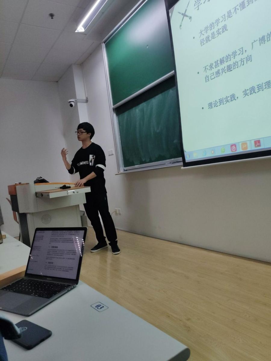 首先发言的是童翰文同学,他从大一、大二、小建议三个部分具体向学弟学妹们分享了自己的学习经验,并对症下药地针对具体问题提出具体的学习建议,鼓励新生提高自己的检索能力,提高自己的使用工具的能力,寻找和自己志同道合的小伙伴,学会合理释放自己的压力。