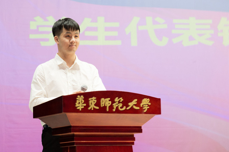 学院2019级博士生研究生钱佳威作为学生代表发言。他向学校为师大学子构建的双创育人生态体系和营造的创新创业文化氛围表示感谢,并始终牢记习近平总书记对青年的殷切期望,要敢为人先、敢于突破,踔厉奋发,努力为国家和学校的发展贡献数字智慧、信息力量、智造方案。